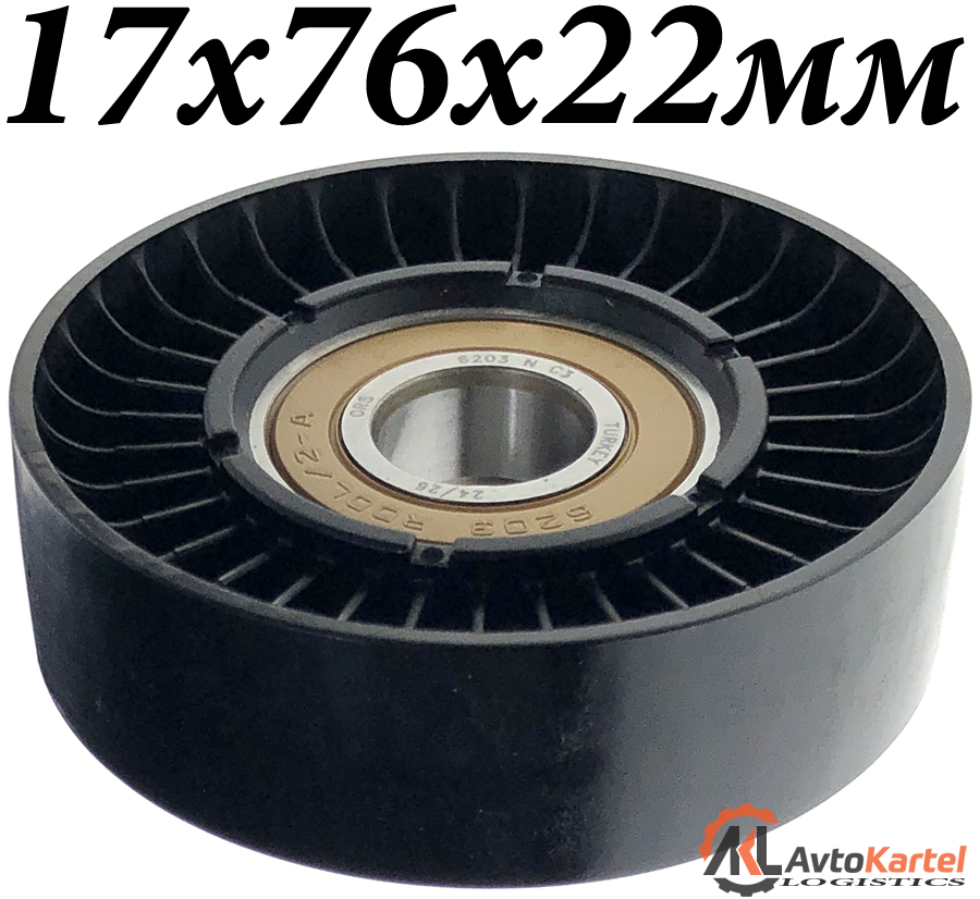 Ролик 17x76x22мм натяжной поликлинового ремня генератора MERCEDES-BENZ A-Class W168 A140, A160 97-, Vaneo (414) 1.6, 1.7CDI, 1.9 02-, внутренний диаметр 17мм, внешний диаметр 76мм, ширина 22мм, материал пластик, подшипник 6203 С3
